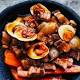 Slow-cooked red-braised pork belly with carrots, eggs and shallots
